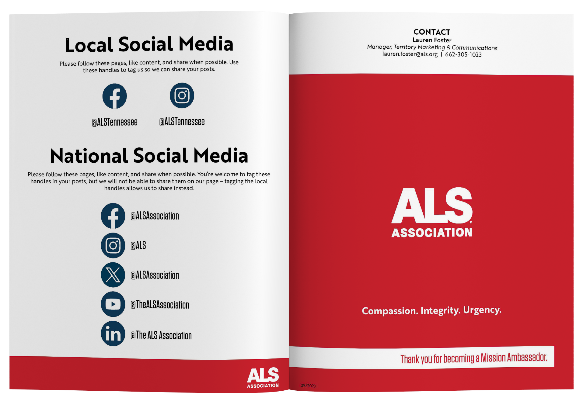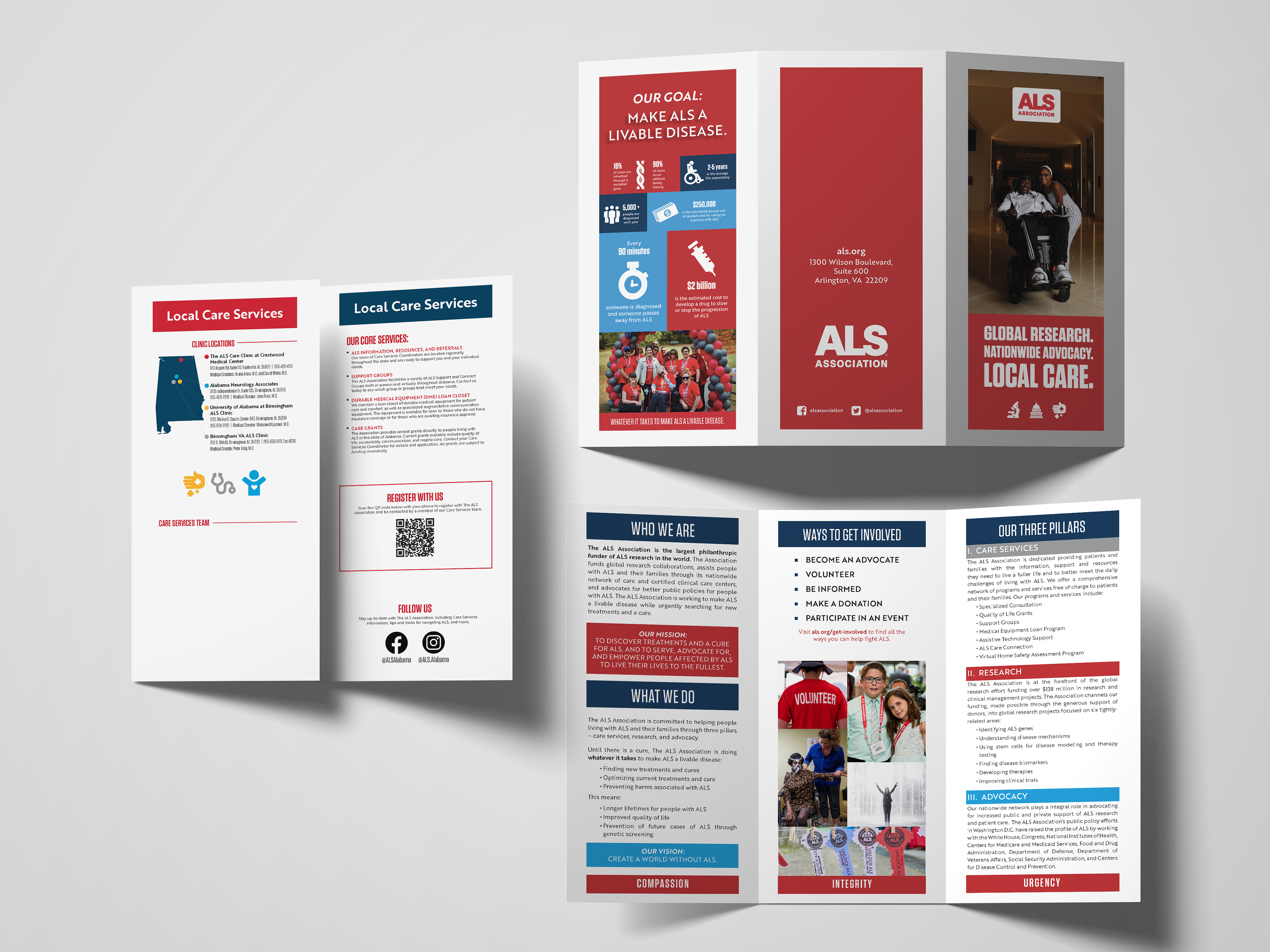 Tri-fold brochure highlighting the general offerings of the ALS Association, used in ALS clinics, at events, and tabling/speaking opportunities. Additional state-specific inserts intended to be printed front and back, allowing for reduced costs when updating local information and reprinting, rather than including the information directly in the brochure.