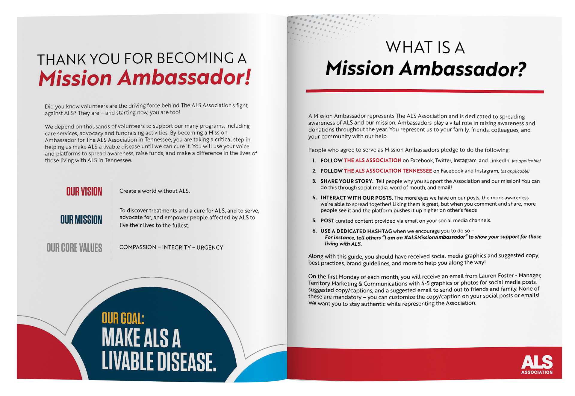 This project serves as the start of the ALS Association's Mission Ambassador Program, engaging local community members with the organization and outlining how their involvement can make an impact. This was a project and program built from the ground up, engaging over 60 volunteers in its pilot launch.